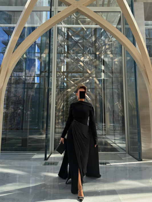 BLACK CREPE AND SATIN SEMI FITTED DRESS WITH DRAPED OVERLAY