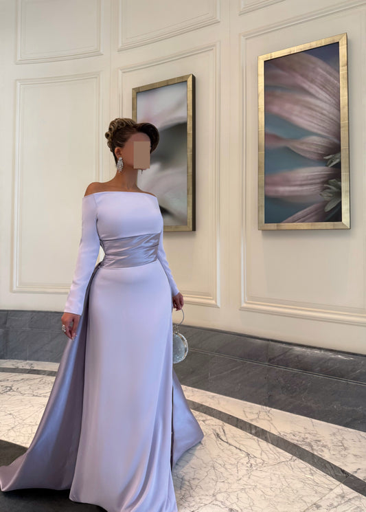 LILAC OFF SHOULDER FITTED DRESS WITH DRAPE AND TRAIL