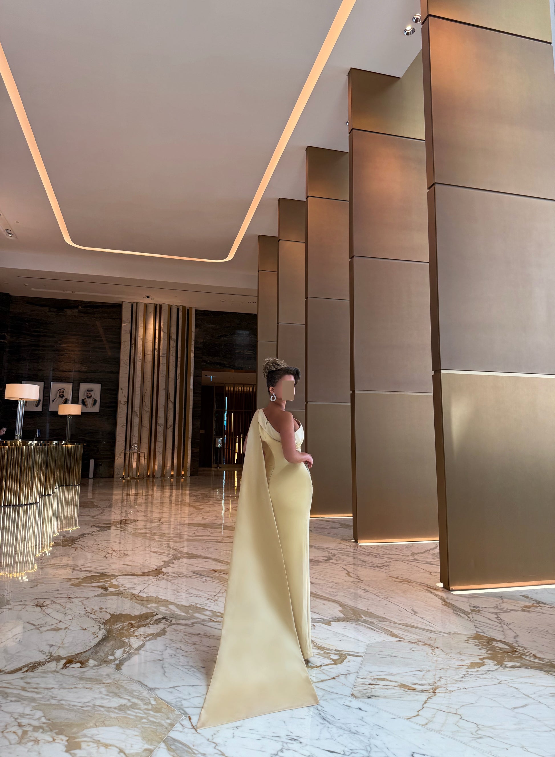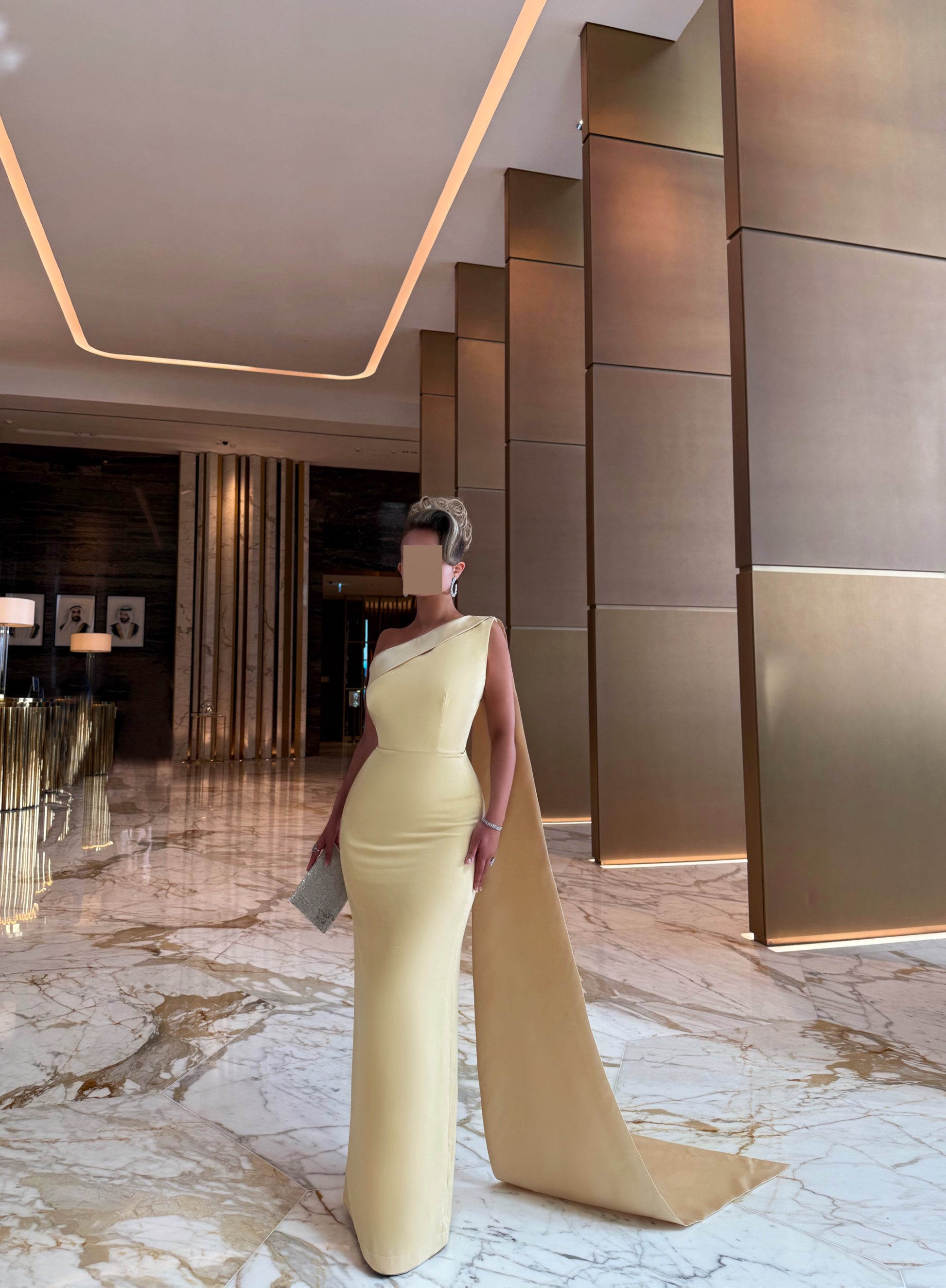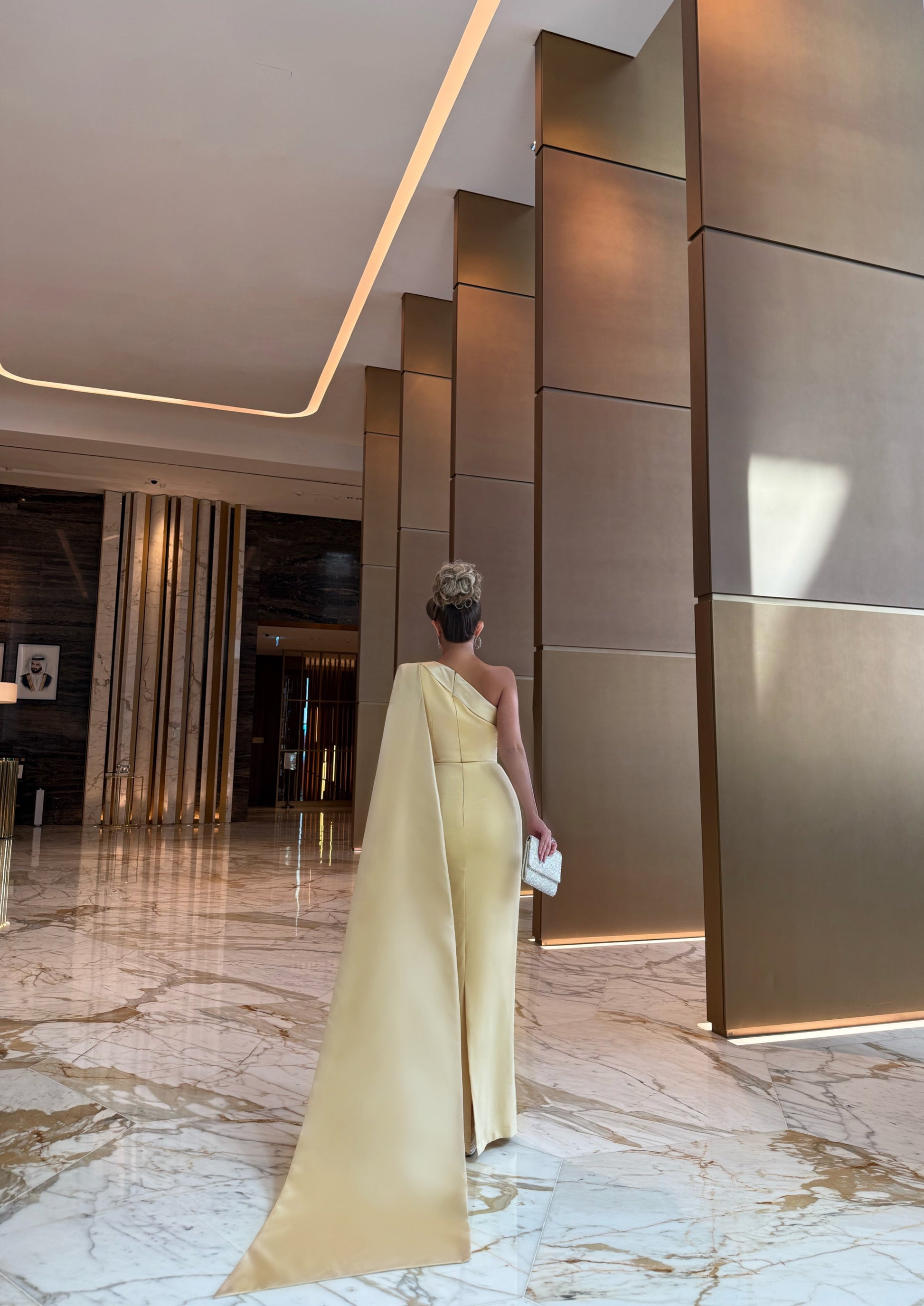 BUTTER YELLOW ONE SHOULDER STRAIGHT FIT DRESS WITH TRAIL