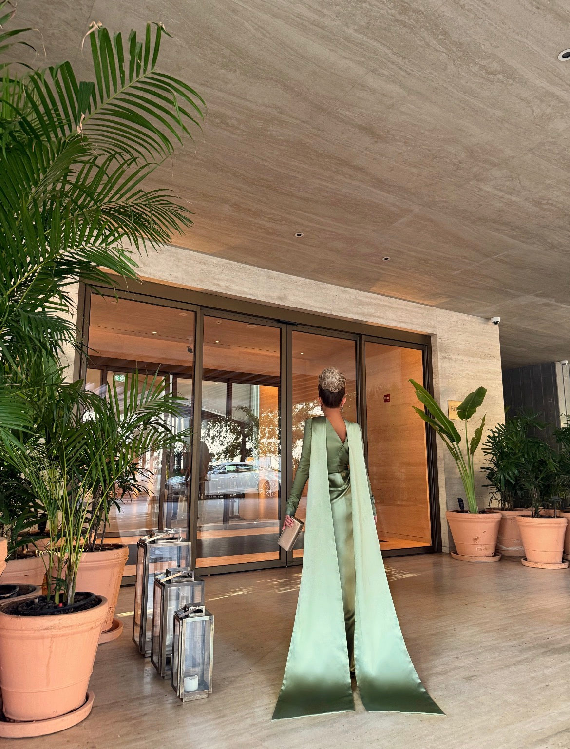 LIGHT OLIVE SEMI FITTED DRESS WITH DRAPED OVERLAY