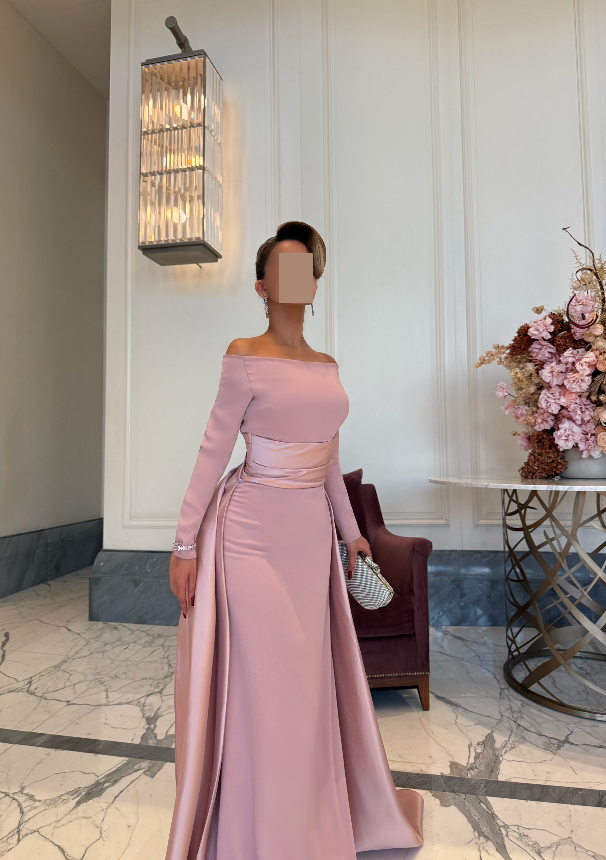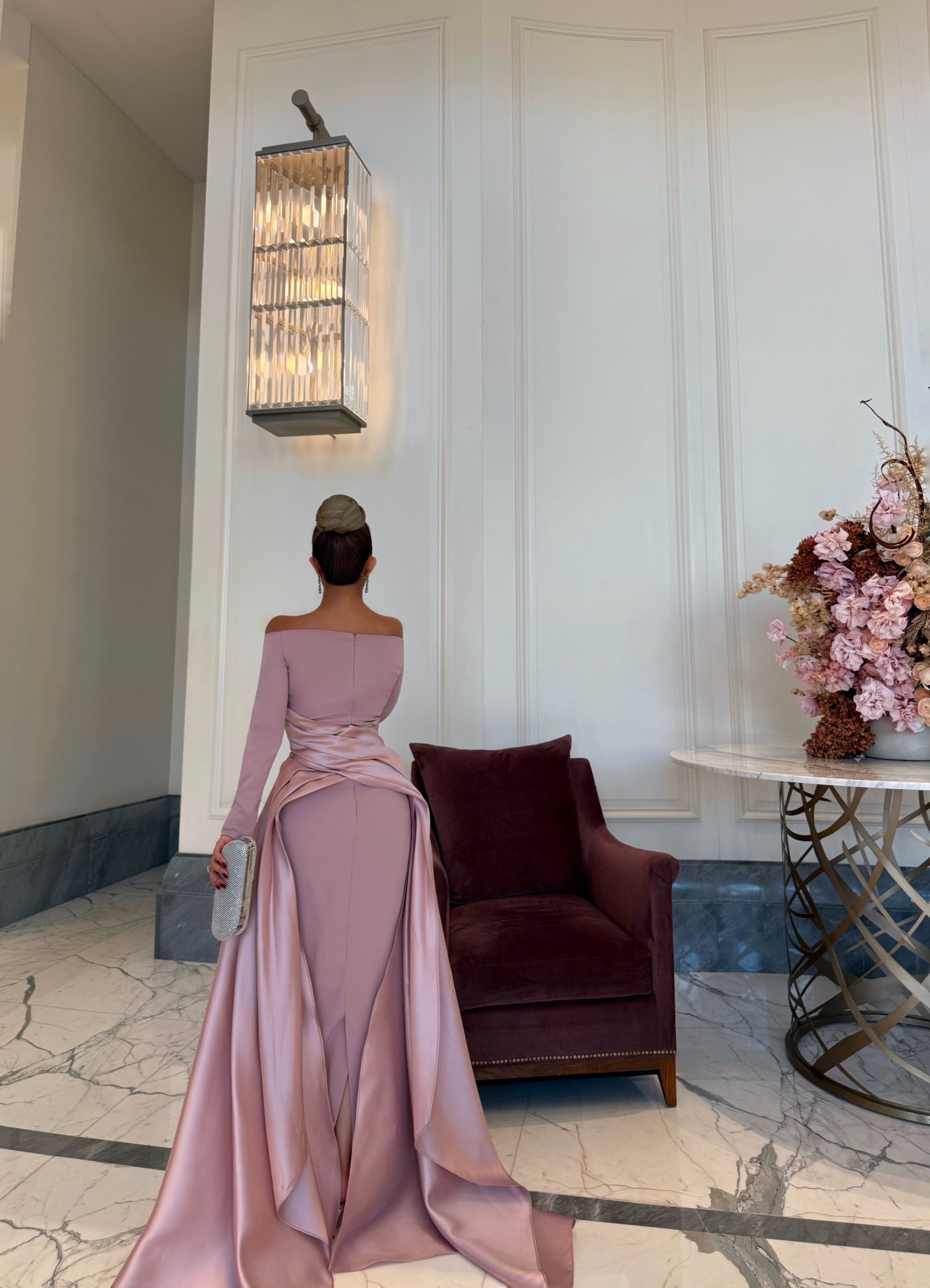 LIGHT PINK OFF SHOULDER FITTED DRESS WITH DRAPE AND TRAIL