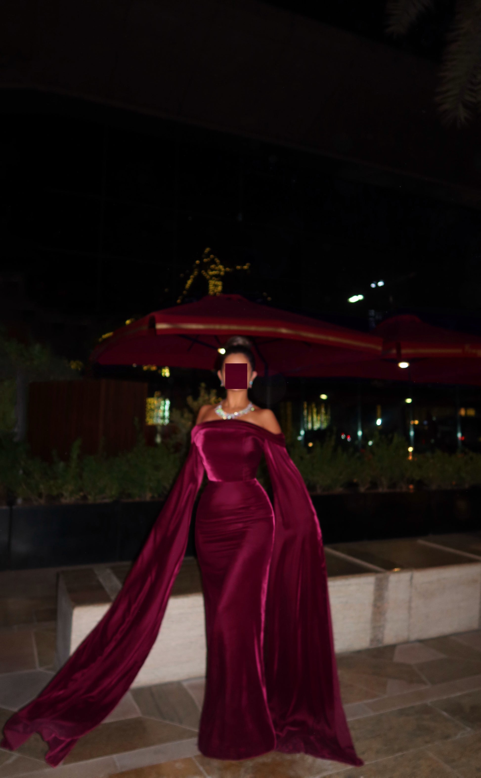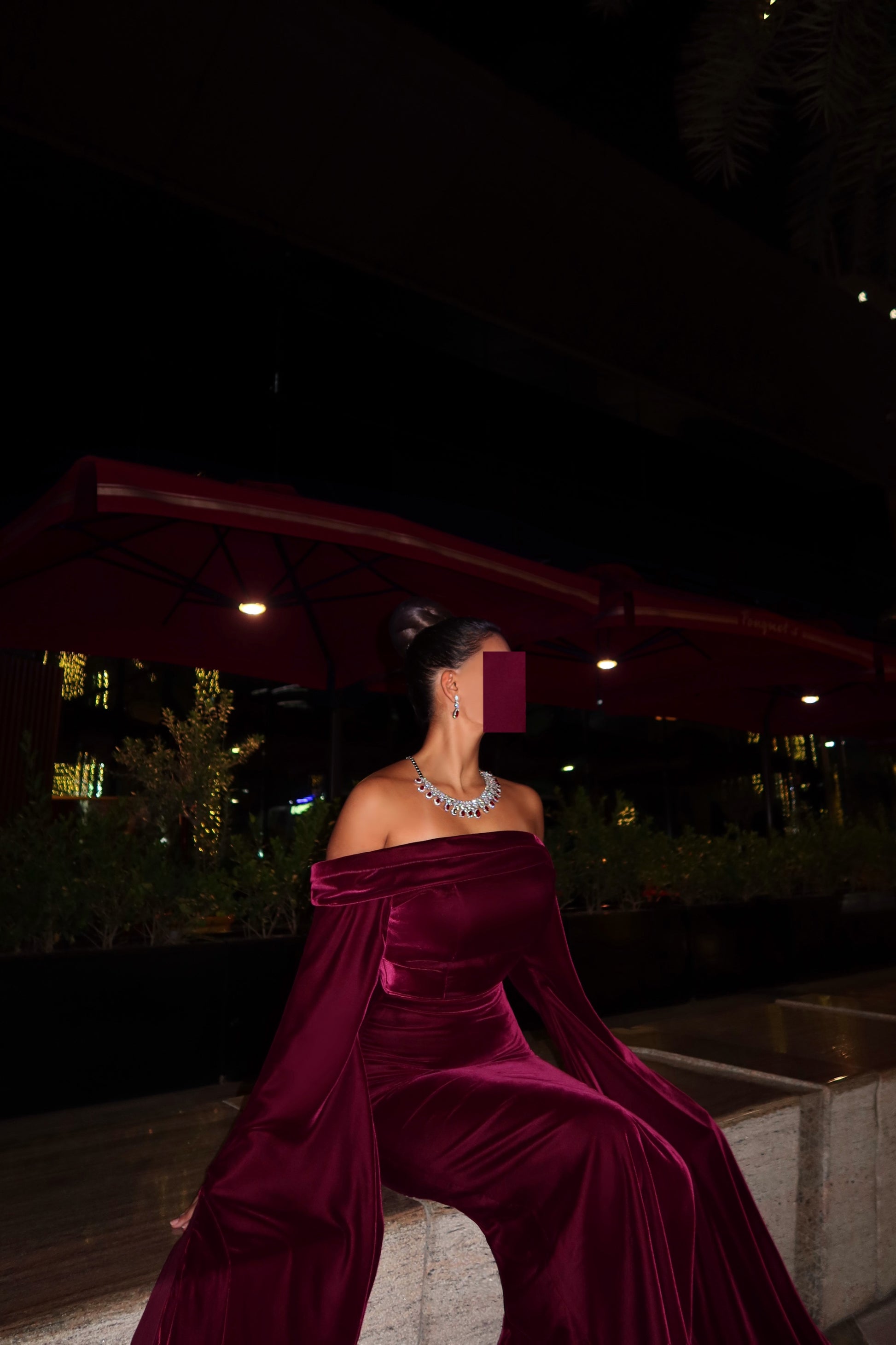 OFF SHOULDER MAROON VELVET LONG SLEEVED DRESS