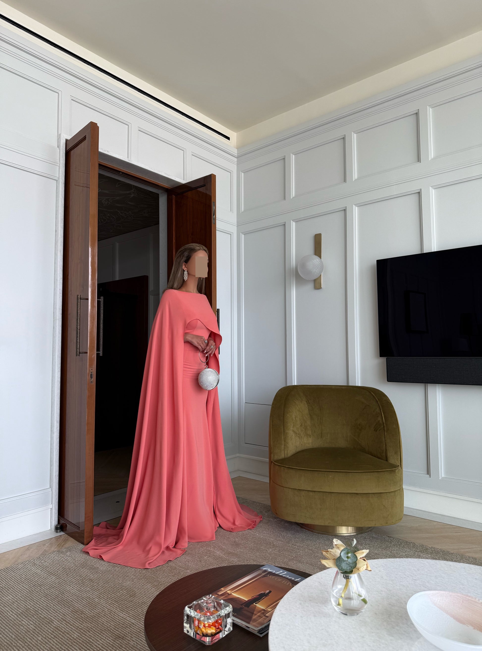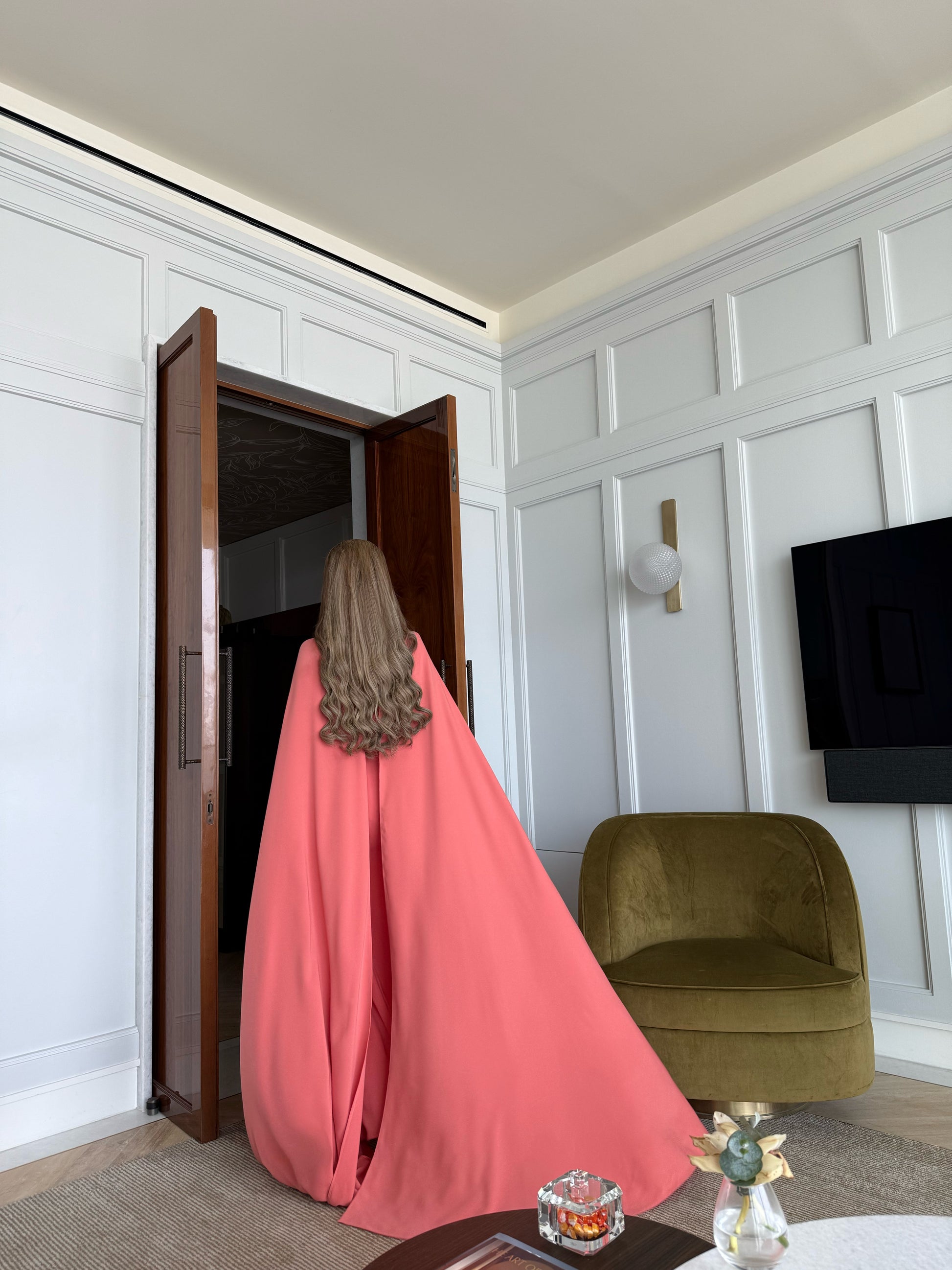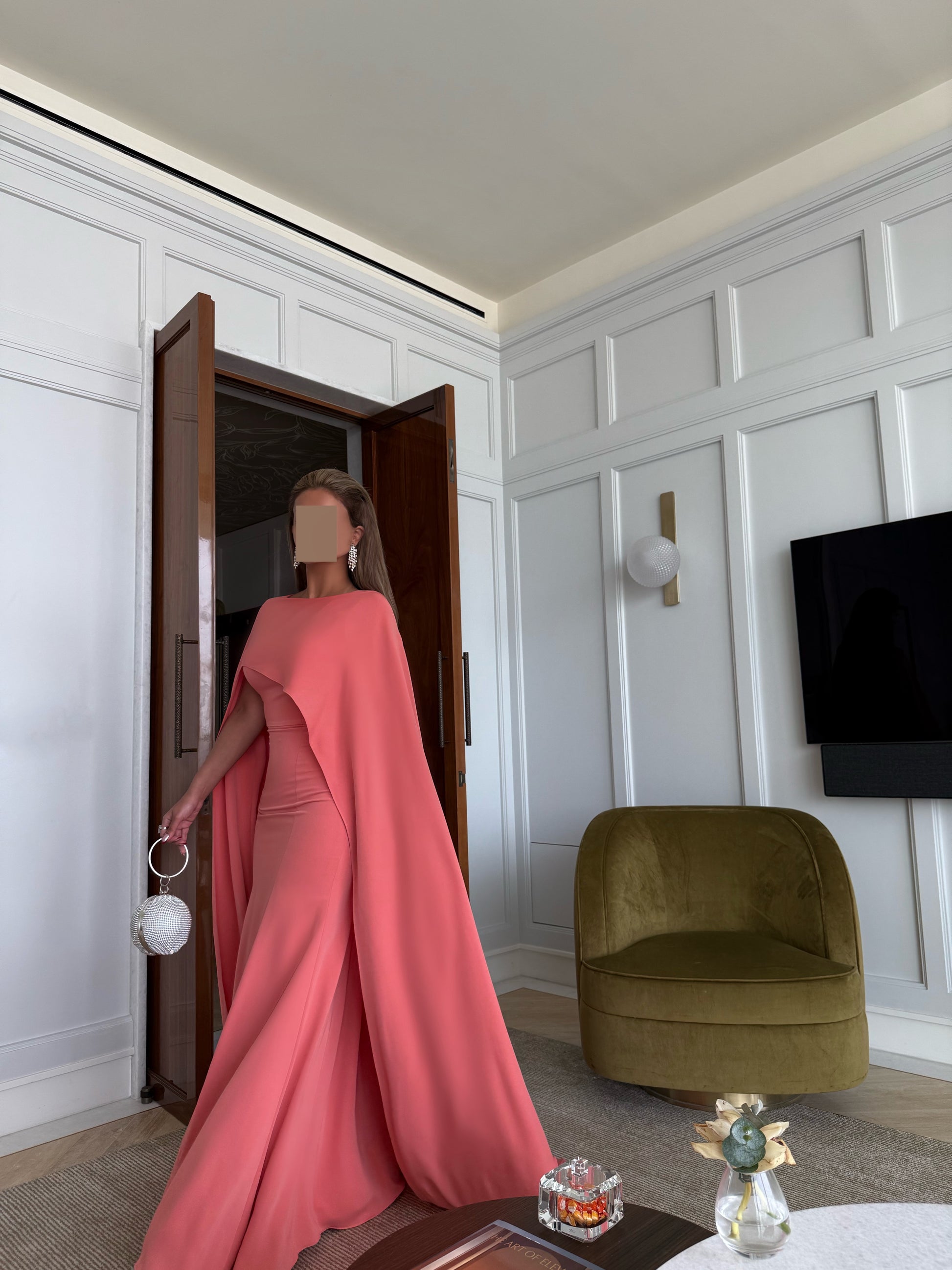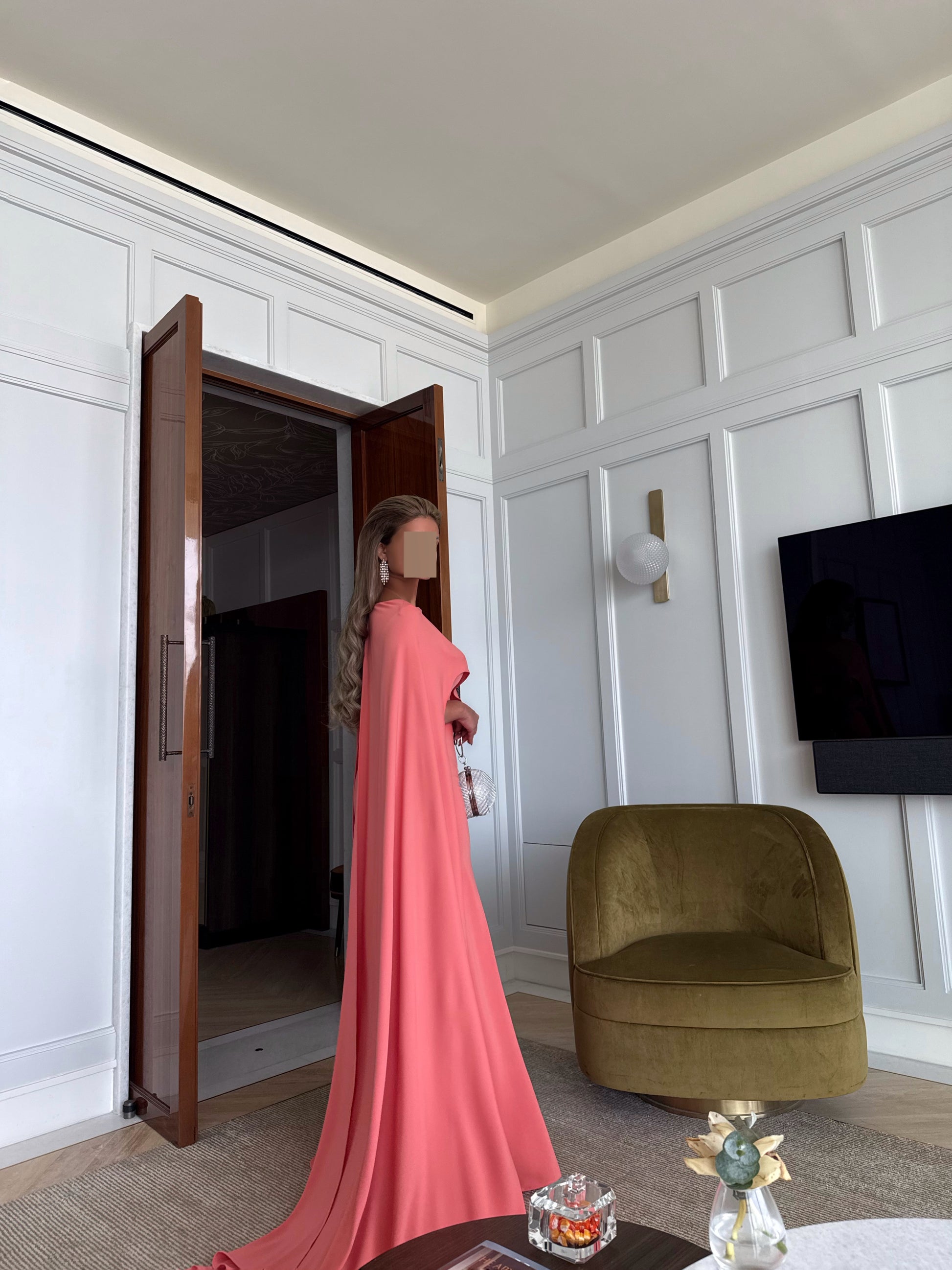PEACH CREPE ASYMMETRIC DRAPE FIT AND FLARE DRESS